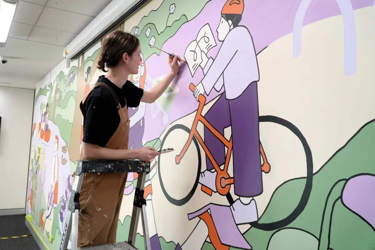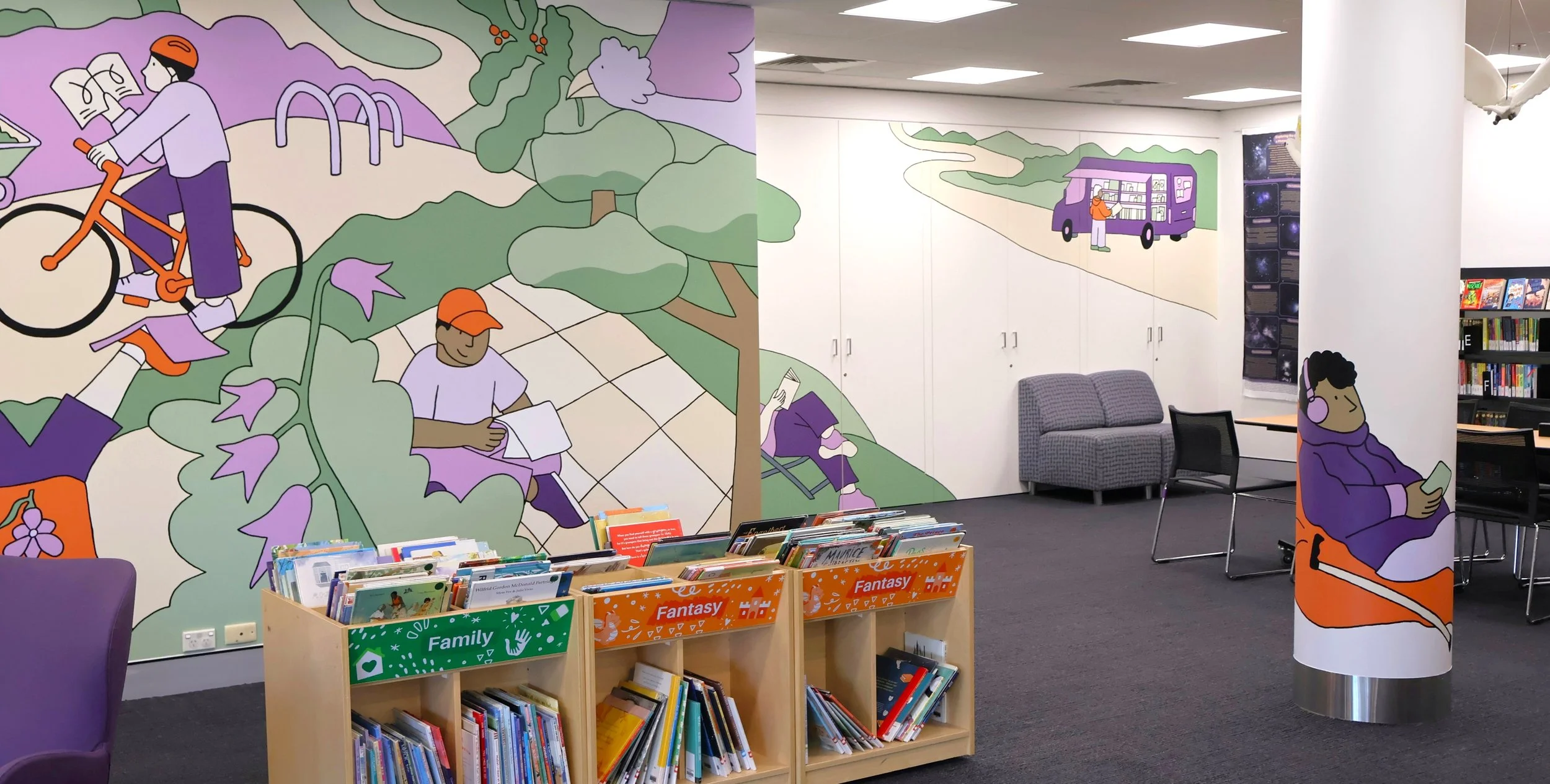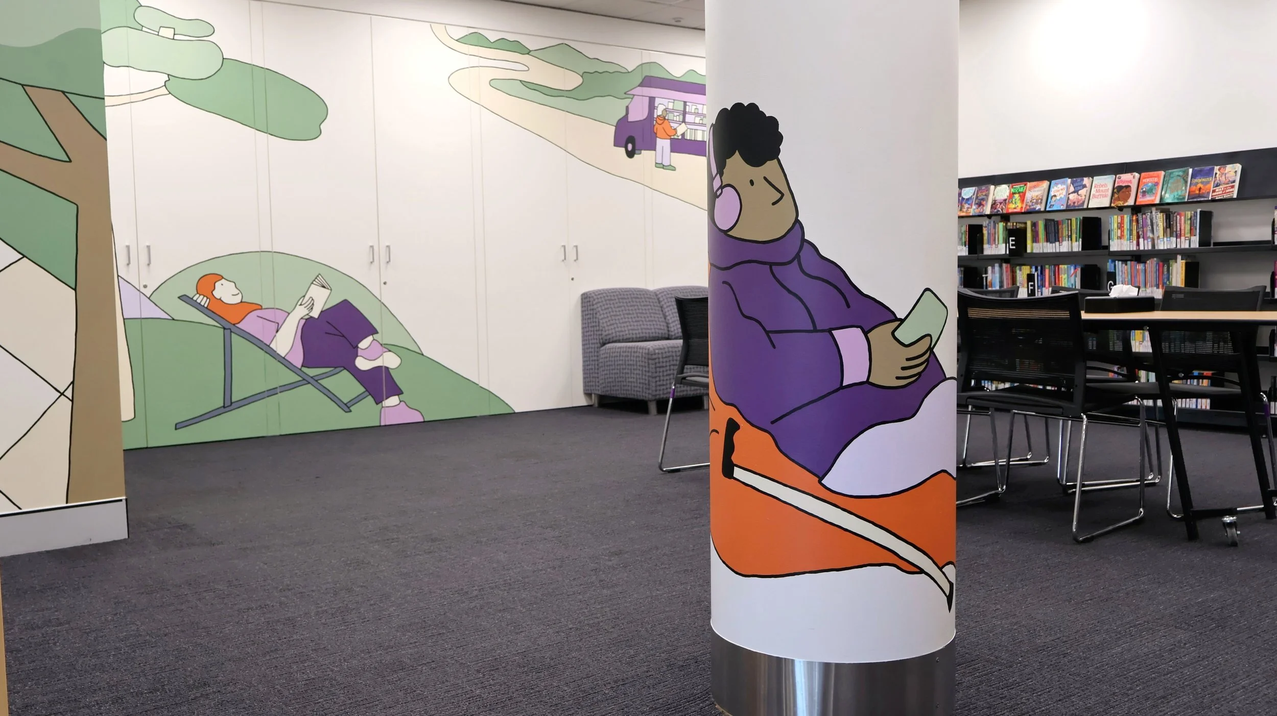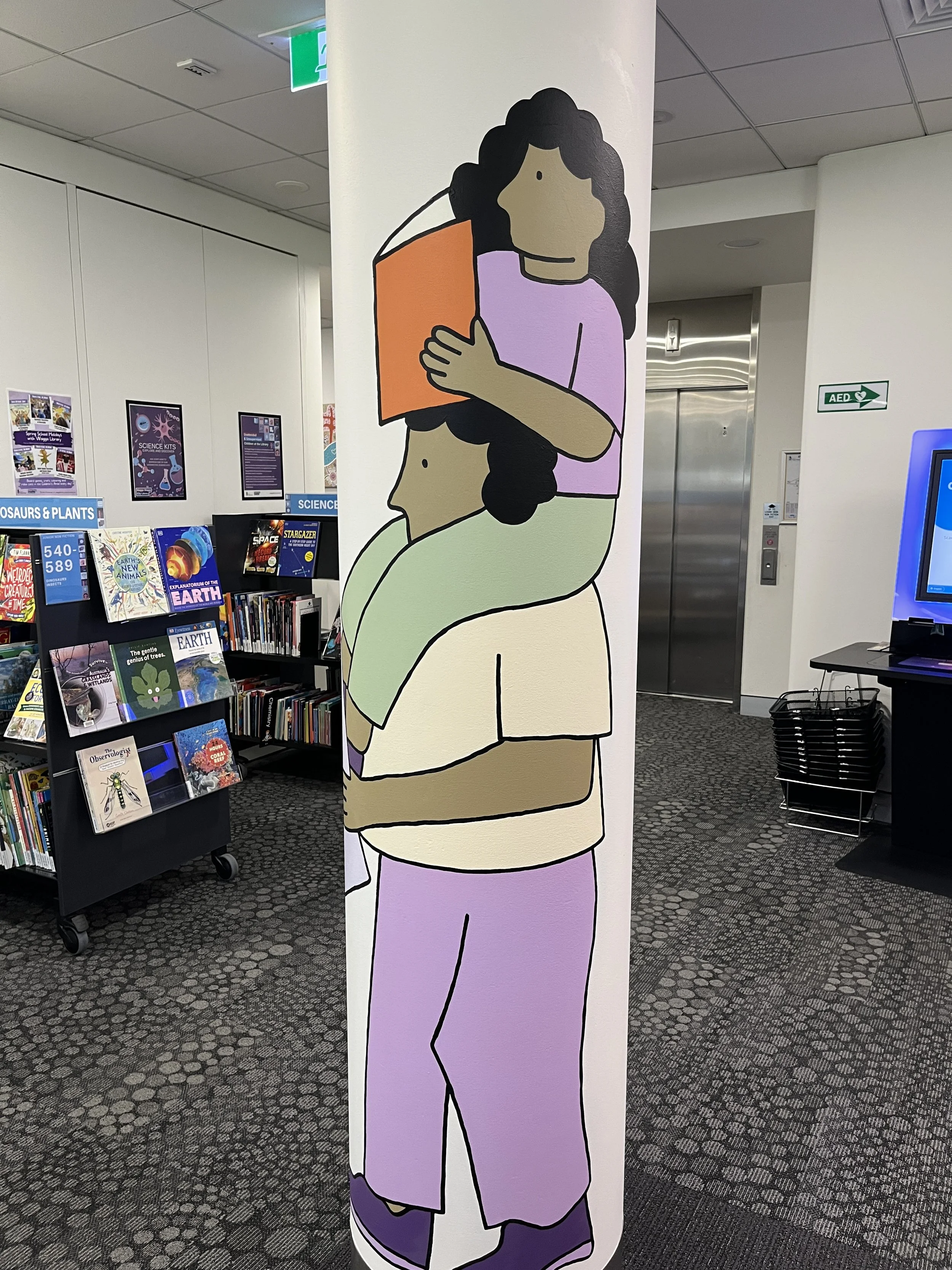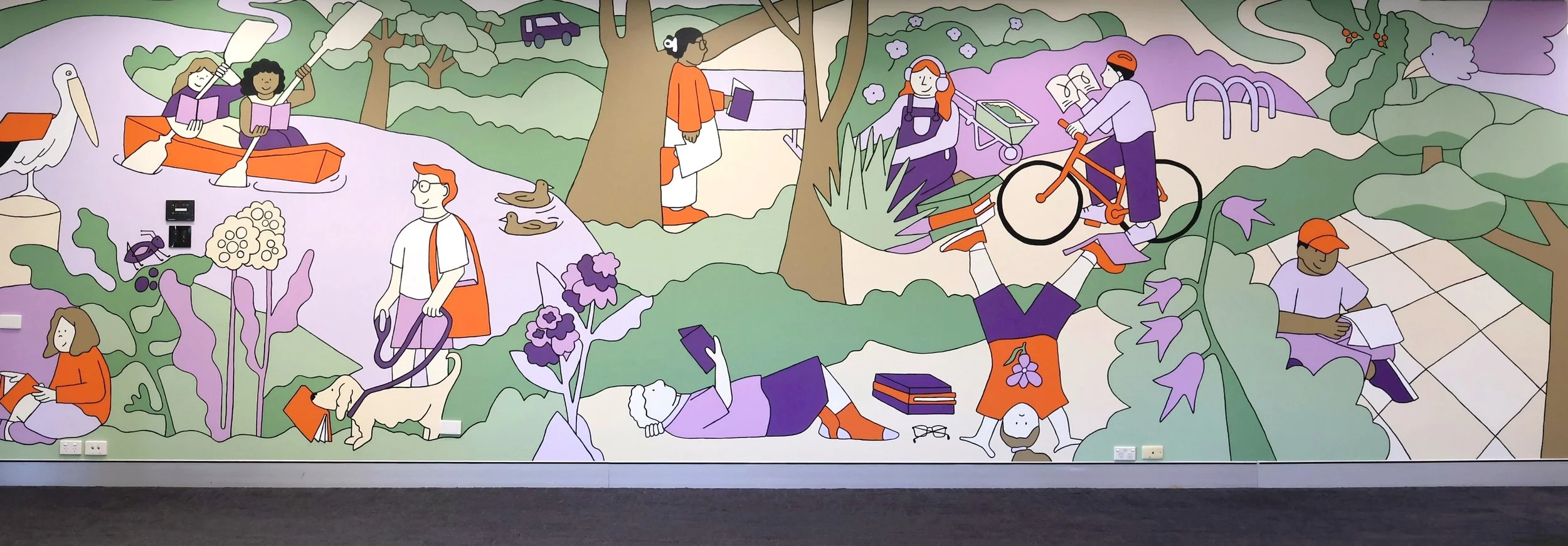 Illustrations created to accompany a new series of murals installed at Wagga Library, titled 'IN GOOD COMPANY'. The murals and series of illustrations are inspired by the places we take our books, and the places they take us. The illustrations depict people taking their books to odd places, from canoeing right through to cycling throughout Wagga Wagga.